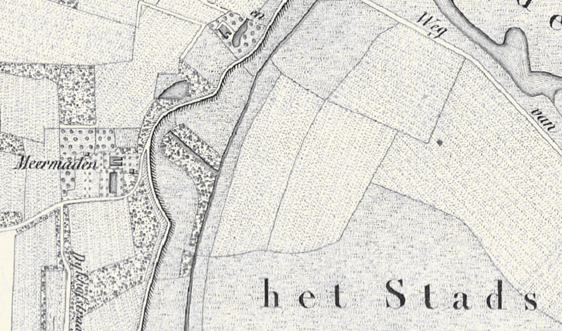 Ooit is de dijk hier tijdens hoogwater doorgebroken. Het water spoelde de grond weg, waardoor diepe waterplassen ontstonden: zogenaamde wielen. De uitgespoelde grond bezonk in een waaier rond het gat, dit noemen we een doorbraakwaaier. Na de doorbraak is de dijk hersteld en waarschijnlijk opnieuw aangelegd op de afgezette grond. Op historische kaarten is al te zien dat de dijk hier een opvallende lus vormt.