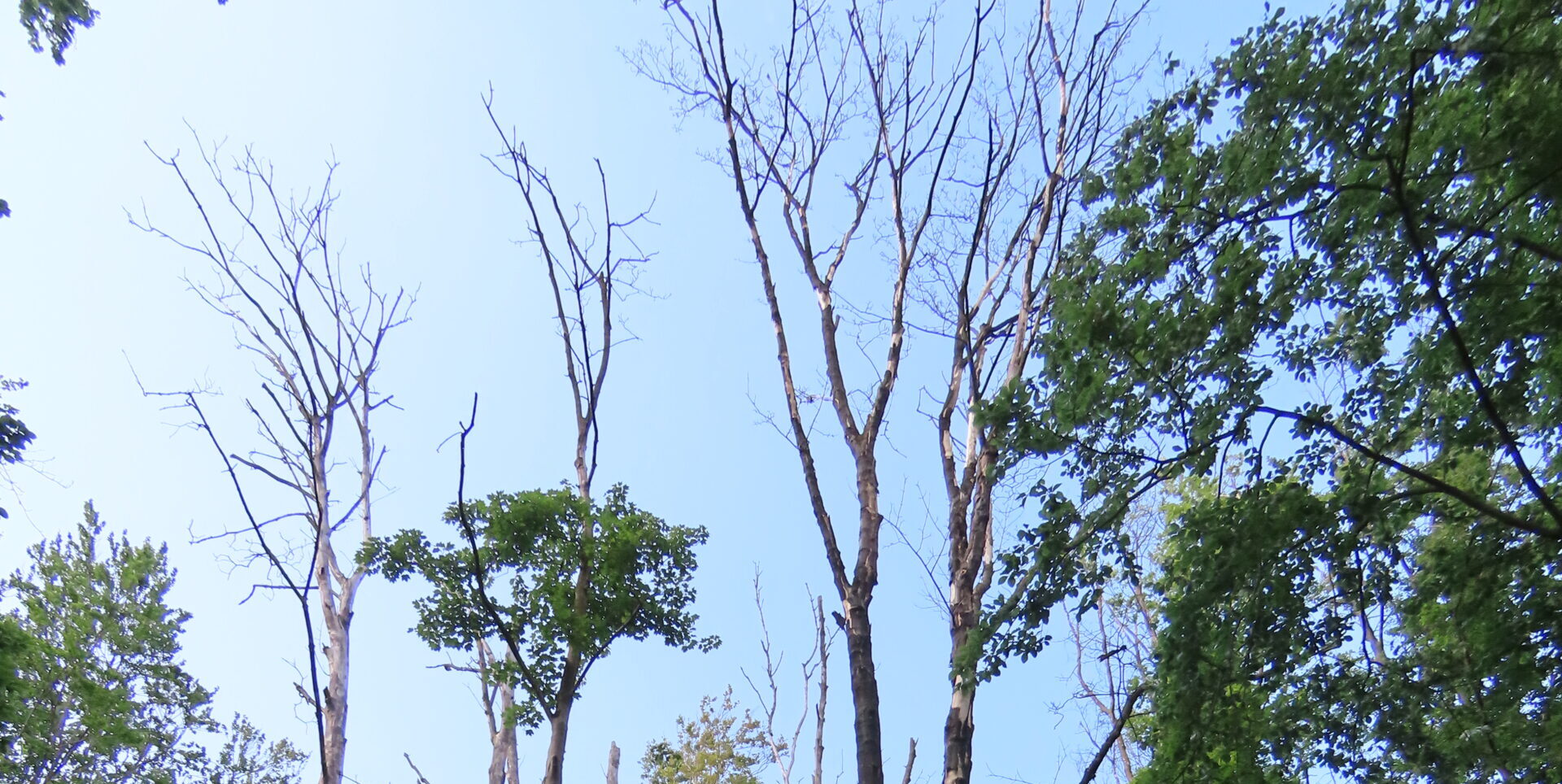 Je hebt het wellicht niet direct in de gaten (in de herfst, als de bladeren weg zijn nog lastiger) maar als je naar boven kijkt, zie je dat de kronen van de bomen geen bladeren meer hebben gedurende de lente/zomer. Een teken van droogte, stress door ziekte, hitte of bodemproblemen, problemen met de wortels of het transportsysteem van de boom. Dit zorgt ervoor dat de boom de voeding niet meer helemaal naar boven kan transporteren (fotos: De Haere, Olst)