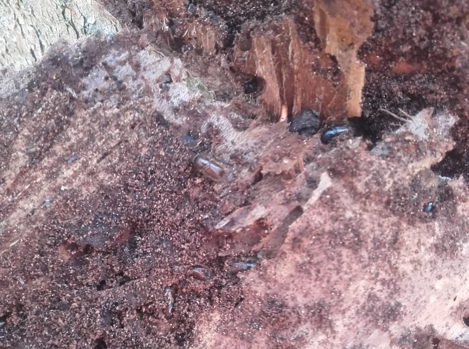 Het mannetje dat zich binnen heeft verschanst scheidt een stofje af waarmee hij vrouwtjes lokt. Die vrouwtjes leggen vervolgens een heleboel eitjes , waarna de larven zich allemaal een weg onder de bast vreten. Daardoor stagneert de sapstroom van de boom. Het eerste zie je dit meestal aan de top van de boom. Maar langzaam kleuren de takken bruin en sterft de boom af. En het gaat om een groot aantal bomen; van de 90 ha fijnspar is ongeveer de helft door deze kever aangetast.