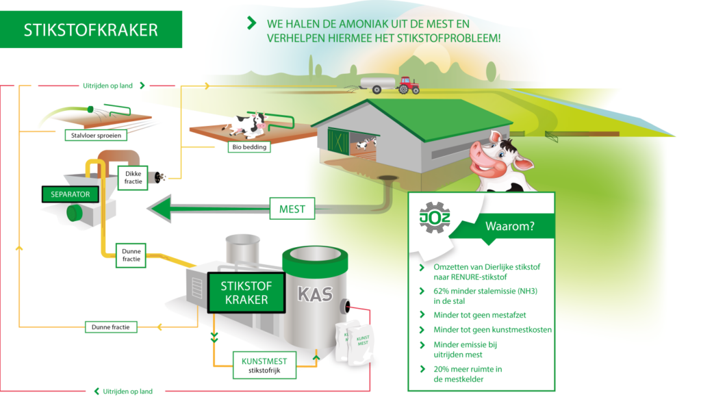Een stikstofkraker vangt de stikstof in de vorm van ammoniak af en zet dit om naar een kunstmestvervanger die weer op eigen grond gebruikt wordt. Hoe werkt dat? Allereerst scheidt de stikstofkraker de mest in een vaste en een vloeibare fractie. De vaste stof wordt gedroogd en gebruikt als comfortabel stalbed voor de koeien en daarna als organische mest uitgereden op het land. De dunne fractie wordt, via een proces met zuur en loog, door ventilatie omgezet in de kunstmestvervanger die rijk is aan stikstof en weer wordt uitgereden op eigen grond. Er is zo geen mestafvoer en geen aankoop van kunstmest meer nodig: de kringloop sluit op het eigen erf.