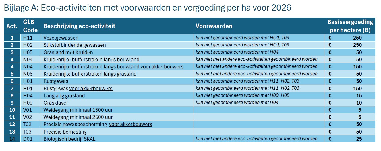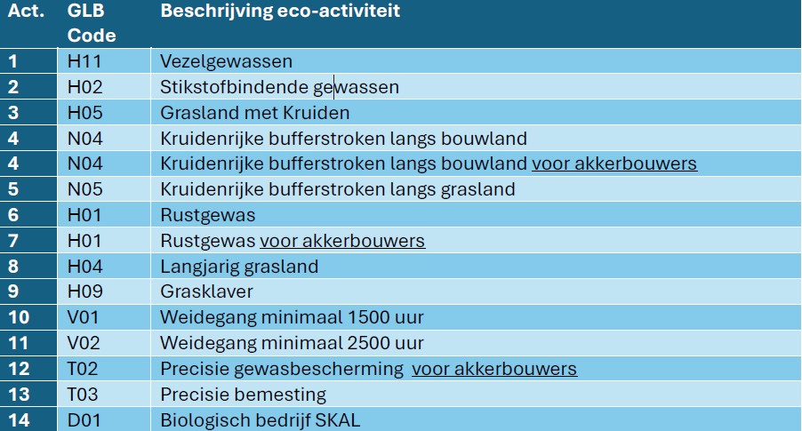 De eco-activiteiten waarvoor wij extra, aanvullend op het GLB, belonen zijn:
