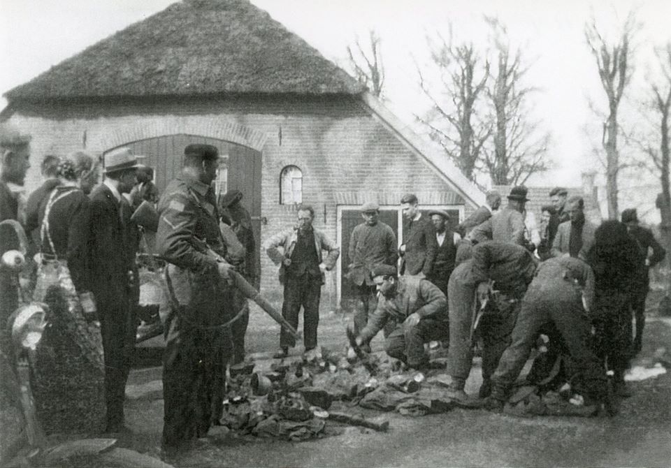 Tot elf uur ’s avonds lagen we daar dicht tegen elkaar gedrukt. De granaten knapten om ons heen. Om ca 6 uur ’s avonds kropen wij even uit de schuilplaats om te kijken of er nog wat te redden viel. Vader kon nog een jong kalfje levend tussen het rokende puin vandaan halen, voor de werkpaarden en het jongvee was het te laat. We probeerden uit een nabij gelegen schuur nog een wagen te redden maar dit lukte niet omdat de brandende kap naar beneden kwam. Terwijl we helemaal niets meer hadden begonnen de gefrustreerde Duitsers vanaf de Raalterweg ook nog eens op ons te schieten. Ik schuilde vlug achter een dikke eik en vrijwel direct sloeg een granaat in bovenin deze boom. Een scherf kwam vlak naast me in de grond terecht. We zijn met z’n allen gauw weer ‘in de suikerkoele’ gevlucht. Om 11 uur ’s avonds werd het wat rustiger en zijn we ‘met opoe in de kruiwagen’ naar buurman Markvoort (boerderij de Hunne) gevlucht. Bij deze buren zijn we zes weken in huis geweest. We hadden niets meer, behalve een traumatische ervaring, maar gelukkig de oorlog wel overleefd.